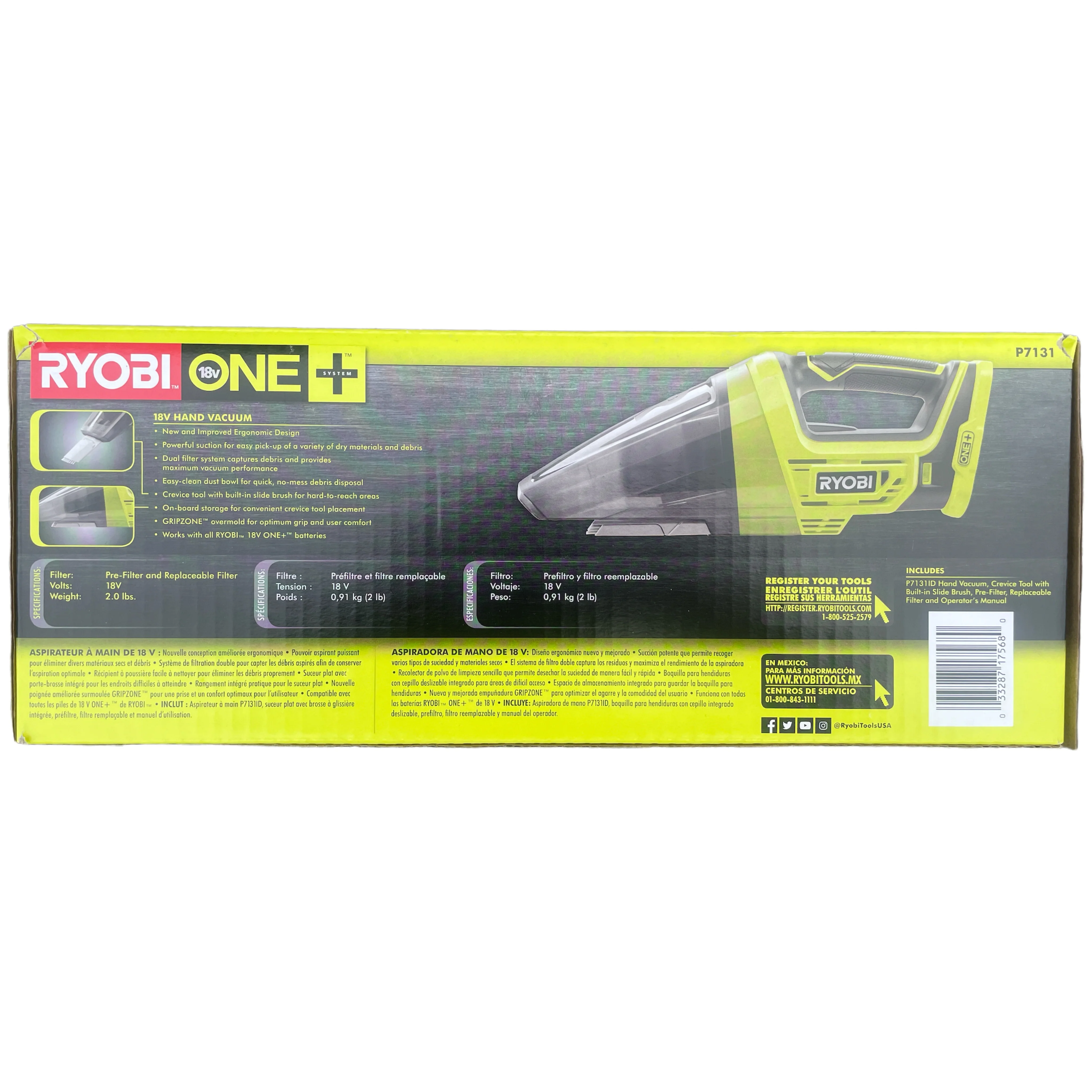 - Includes: (1) P7131 18-Volt ONE+ Cordless Hand Vacuum, crevice tool with built-in slide brush, pre-filter, replaceable filter, and operator's manual